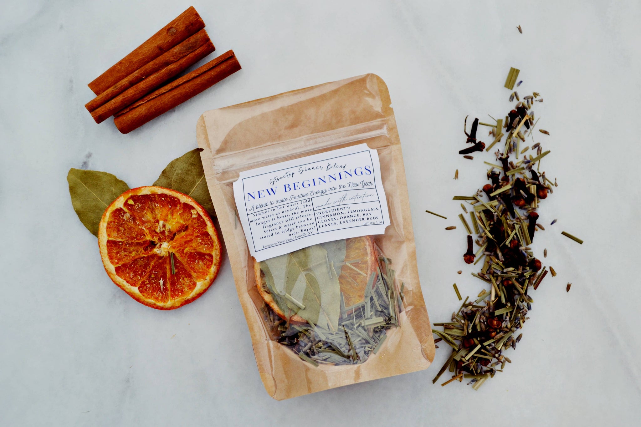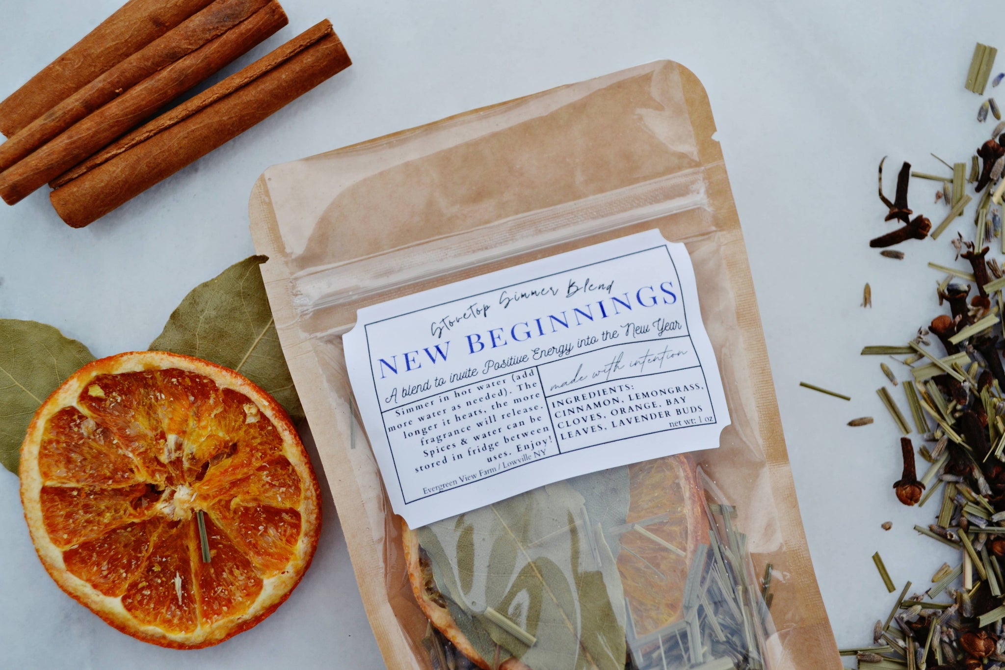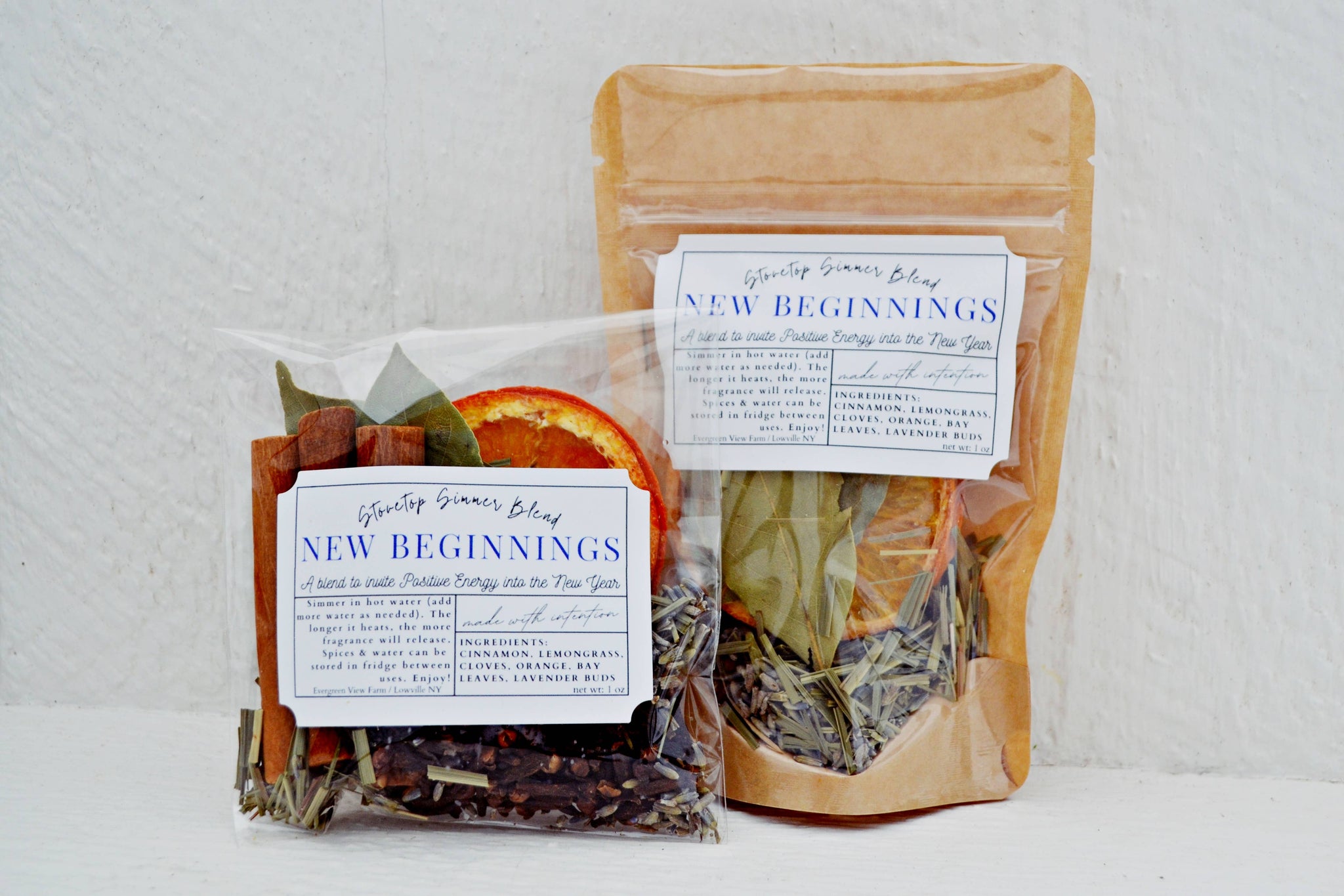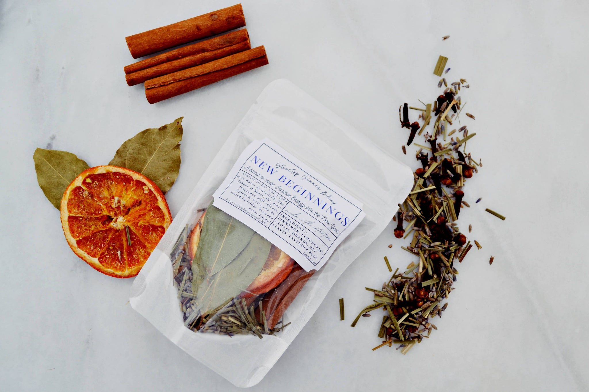 NEW BEGINNINGS blend. Invite positive energy into the New Year. Crafted with herbs and spices that symbolize a fresh start, protection, peace, vitality, and renewal. Perfect for seasonal shifts during the Winter Solstice and New Year. Infuse your space with fragrant steam while focusing on your intentions for a new phase of life. *Ingredients: Cinnamon sticks, lemongrass, cloves, orange, bay leaves, lavender buds *Symbolism: Cinnamon: Success, warmth, protection Lemongrass: Clarity, positive energy Oranges/Citrus: Joy, uplifting energy, cleansing Lavender: Love, healing Bay Leaves: Manifestation, wish fulfillment (write intentions on them) *Directions: Add blend to hot water & simmer on stovetop, adding more water as needed. We use high quality dried spices for a potent blend. While simmering they will release a wonderful fragrance.